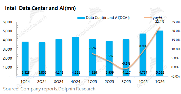 英特尔的数据中心及AI收入在2026年第一季度实现50.5亿美元,同比增长22%。增长明显提速,主要来自于AI服务器CPU等相关需求的带动。