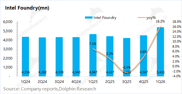 英特尔的晶圆代工业务收入在2026年第一季度实现54.2亿美元,同比增长16%。