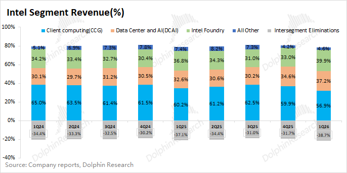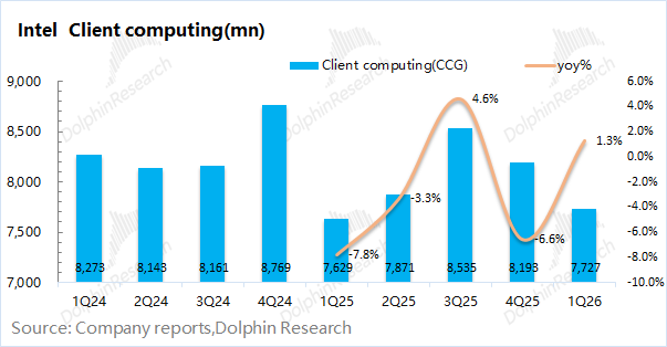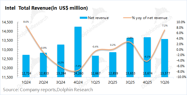 1.1收入端:英特尔在2026年第一季度实现营收136亿美元,同比增长7%,大幅超出指引区间(117-127亿美元),主要是受服务器CPU需求增加和产品提价的带动。