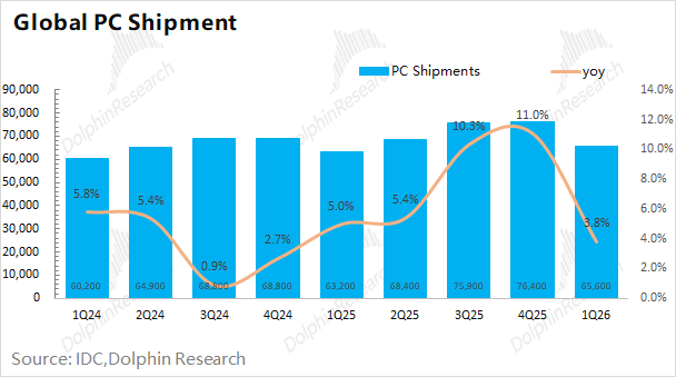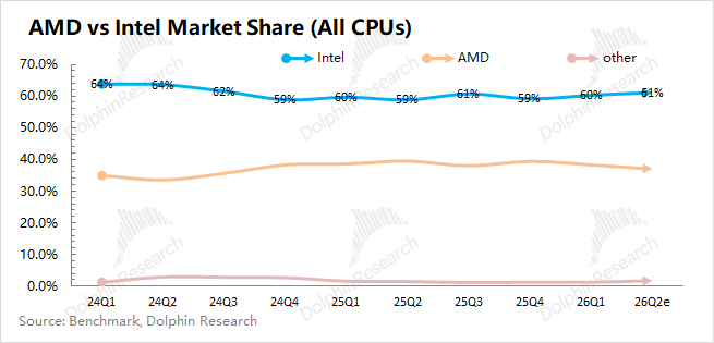 结合IDC行业数据来看,本季度全球出货量为6560万台,同比增长3.8%。受存储涨价、国补收紧等因素影响,整体行业相对低迷。相比而言,公司客户端收入同比增长1.3%,这表明当前英特尔在PC市场的份额仍有“丢失”。在桌面级CPU市场中,AMD的市场份额已经实现了对英特尔的反超。