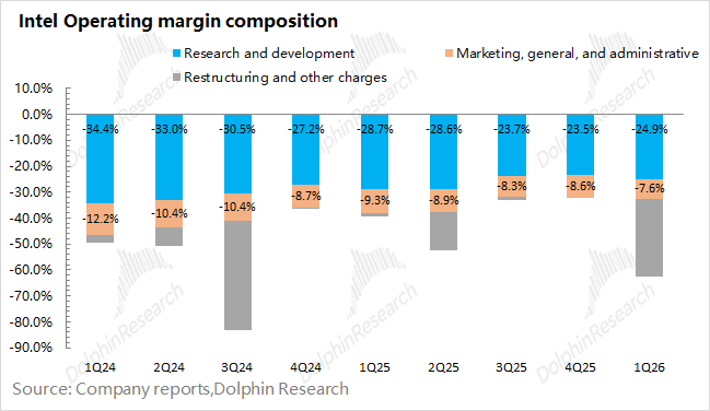 1.3经营费用端:英特尔在2026年第一季度核心经营费用为44亿美元,同比下滑8%。此前公司新任CEO定下“削减成本开支”的目标后,经营费用也是一个关注点。