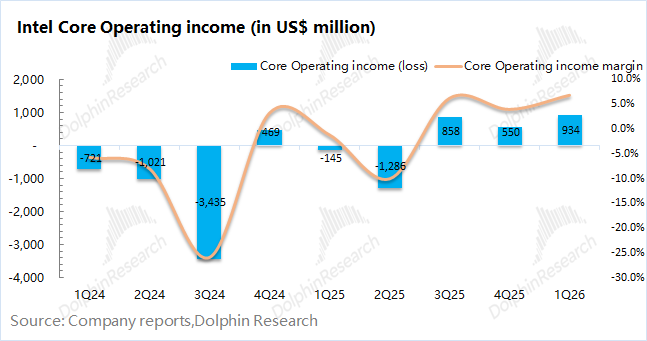 1.4净利润端:英特尔在2026年第一季度净亏损为37.3亿美元。从经营角度来看,公司本季度核心经营性利润约为9.3亿美元,这更能反映公司真实的经营状况。本季度公司核心利润环比提升,主要是服务器CPU提价及公司整体毛利率回升的带动。