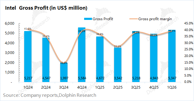 1.2毛利及毛利率:英特尔在2026年第一季度实现毛利53.5亿美元,环比增长14%。其中公司本季度毛利率39.4%,环比提升3.3 pct,大超市场预期(32.5%)。毛利率提升,主要受服务器CPU提价和工艺良率提升的带动。