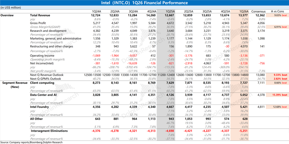 英特尔于北京时间2026年4月24日上午的美股盘后发布了2026年第一季度财报(截止2026年3月),要点如下: