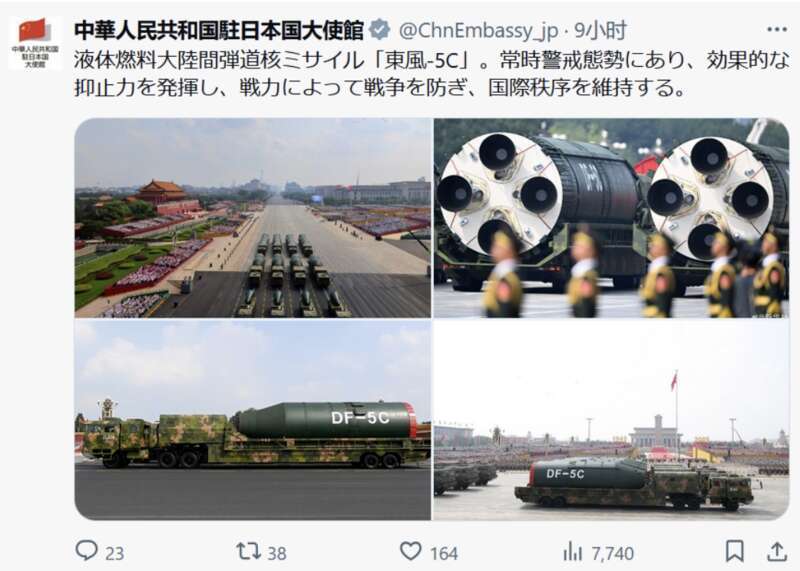 据观察者网消息,9月6日,中国驻日本大使馆在海外社交平台X上发布东风-5C导弹在纪念中国人民抗日战争暨世界反法西斯战争胜利80周年阅兵式上首次公开亮相的照片。