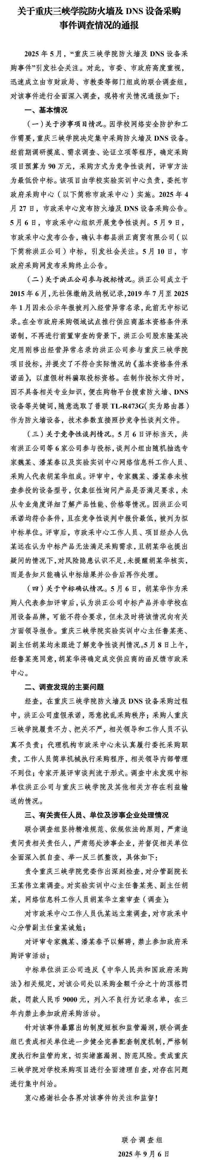 重庆市教委通报重庆三峡学院防火墙及DNS设备采购事件调查情况